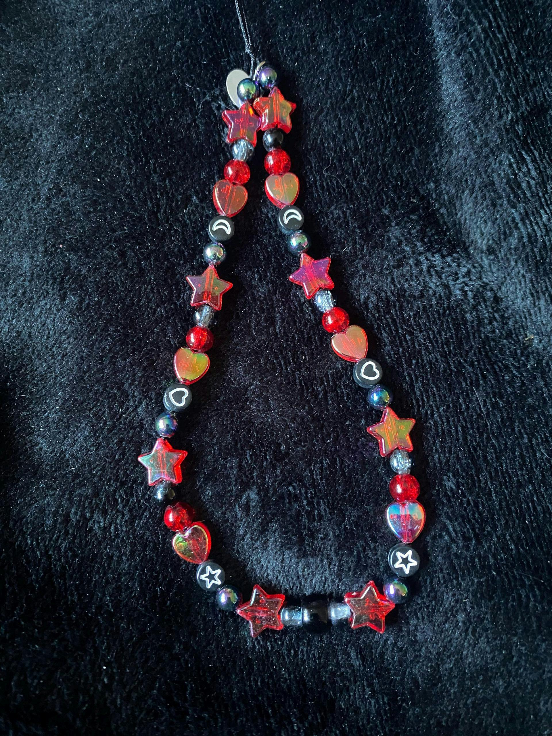 Beaded phone strap charm made with a mix of super cute red and black iridescent hearts, stars and symbol beads featuring a silver Magical Meow heart charm!