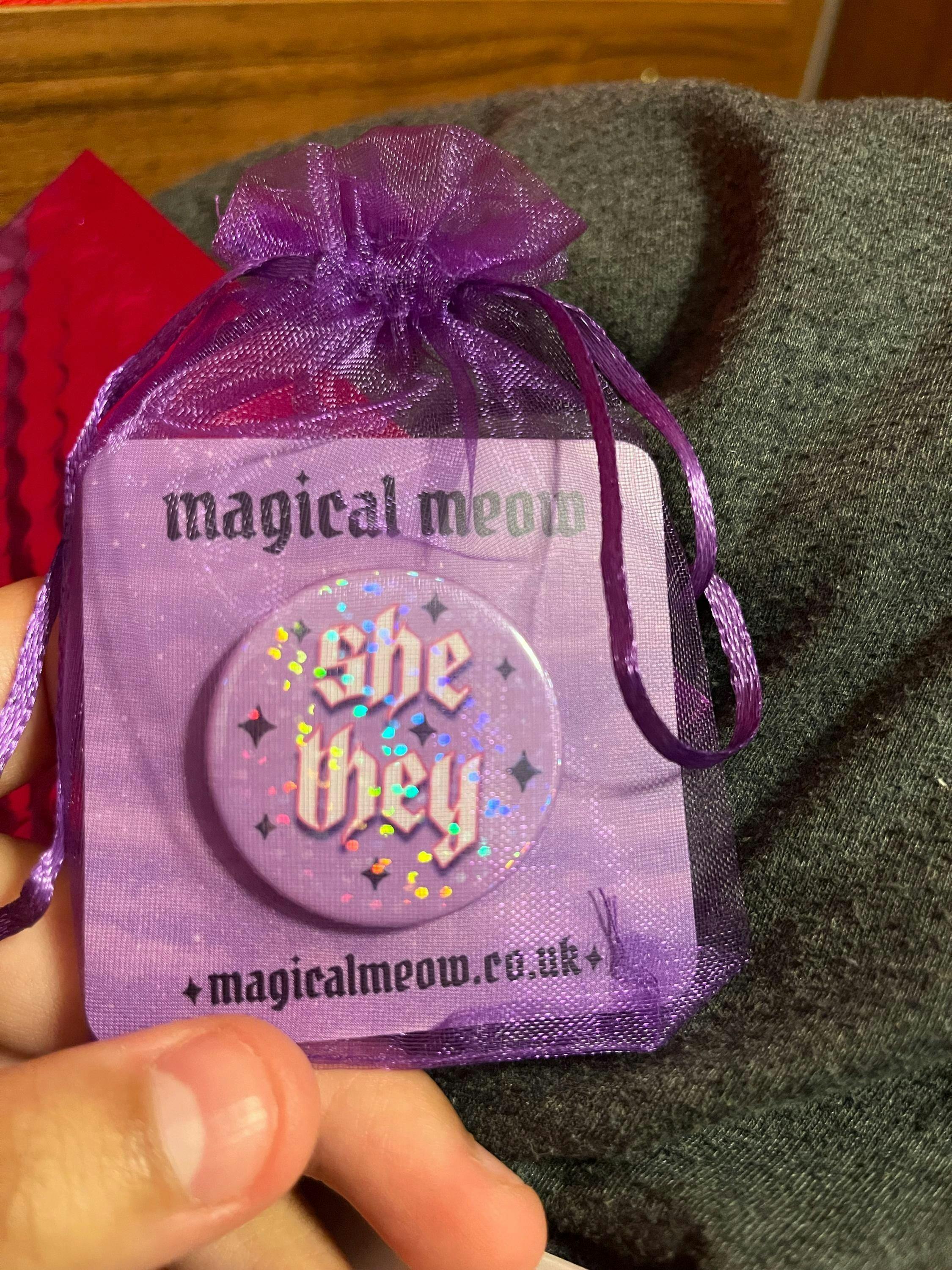 Lilac, black and pink magical/pastel goth aesthetic style badge featuring she/they pronouns!